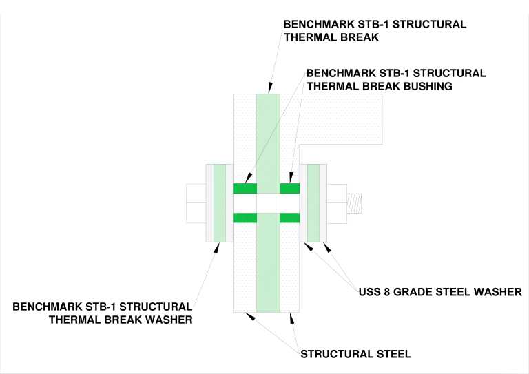 STB-1 Thermal Break washers and bushings can be used on the warm face of the structure, and including a thermal break at the bolt connection will reduce heat loss an additional 4% per bolt, depending on the wall assembly connection. Without these thermal break solutions, condensation can occur on the bolt heads which can develop into damp and mold issues.